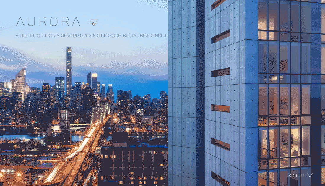 在这里另外介绍两种有趣的导航设计。Aurora 所采用的是隐藏式的导航,点击 LOGO 旁边的菜单按钮能够显示,而 AndCulture 则直接将顶部导航旋转了 90 度直接放到侧面。